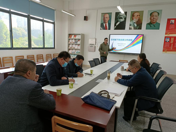 在参观完学校后,学习组校长们到216教室参加全区教育系统从严治党工作会,泡中杨超校长介绍学校党建工作及党员示范作用。