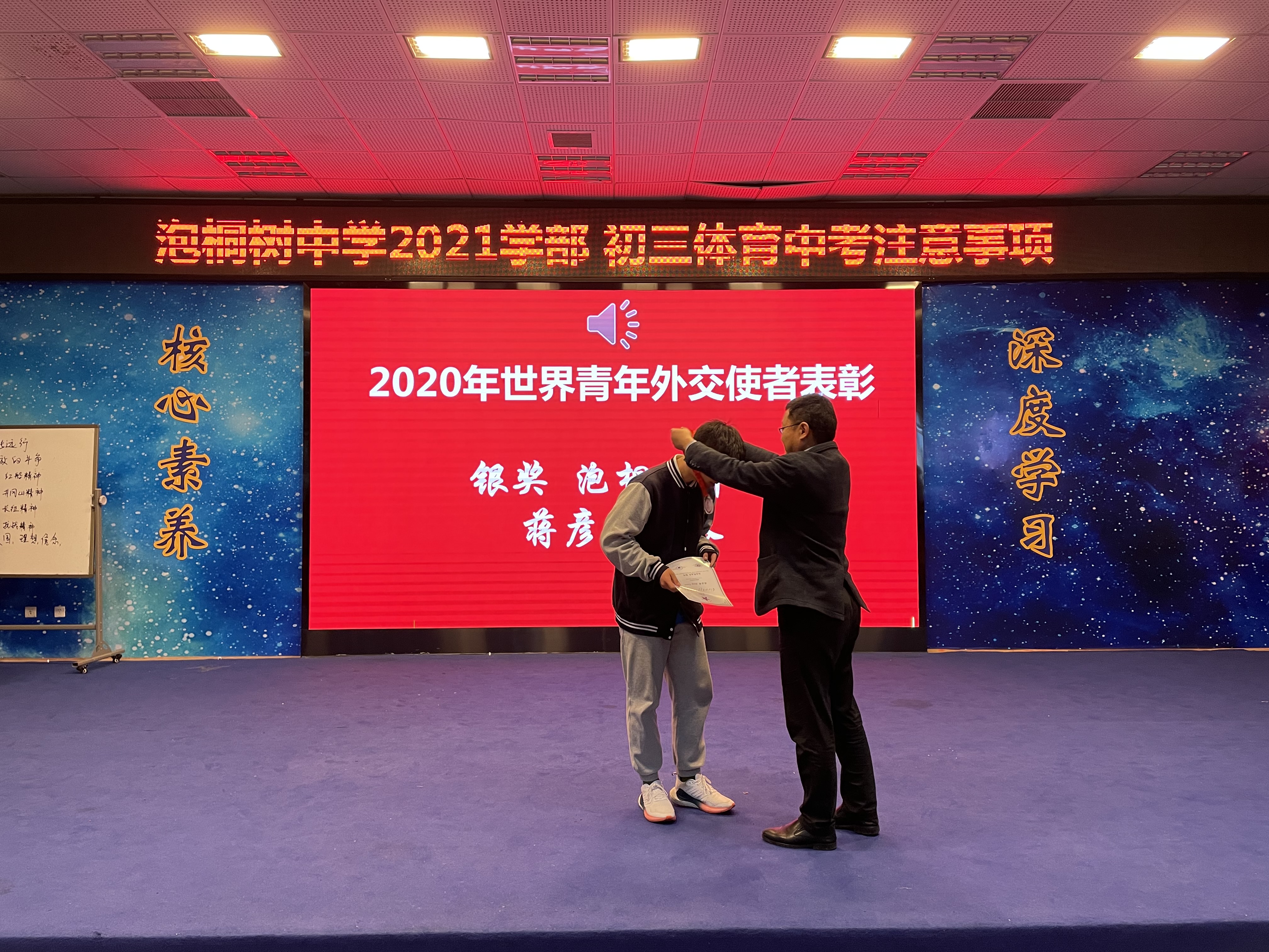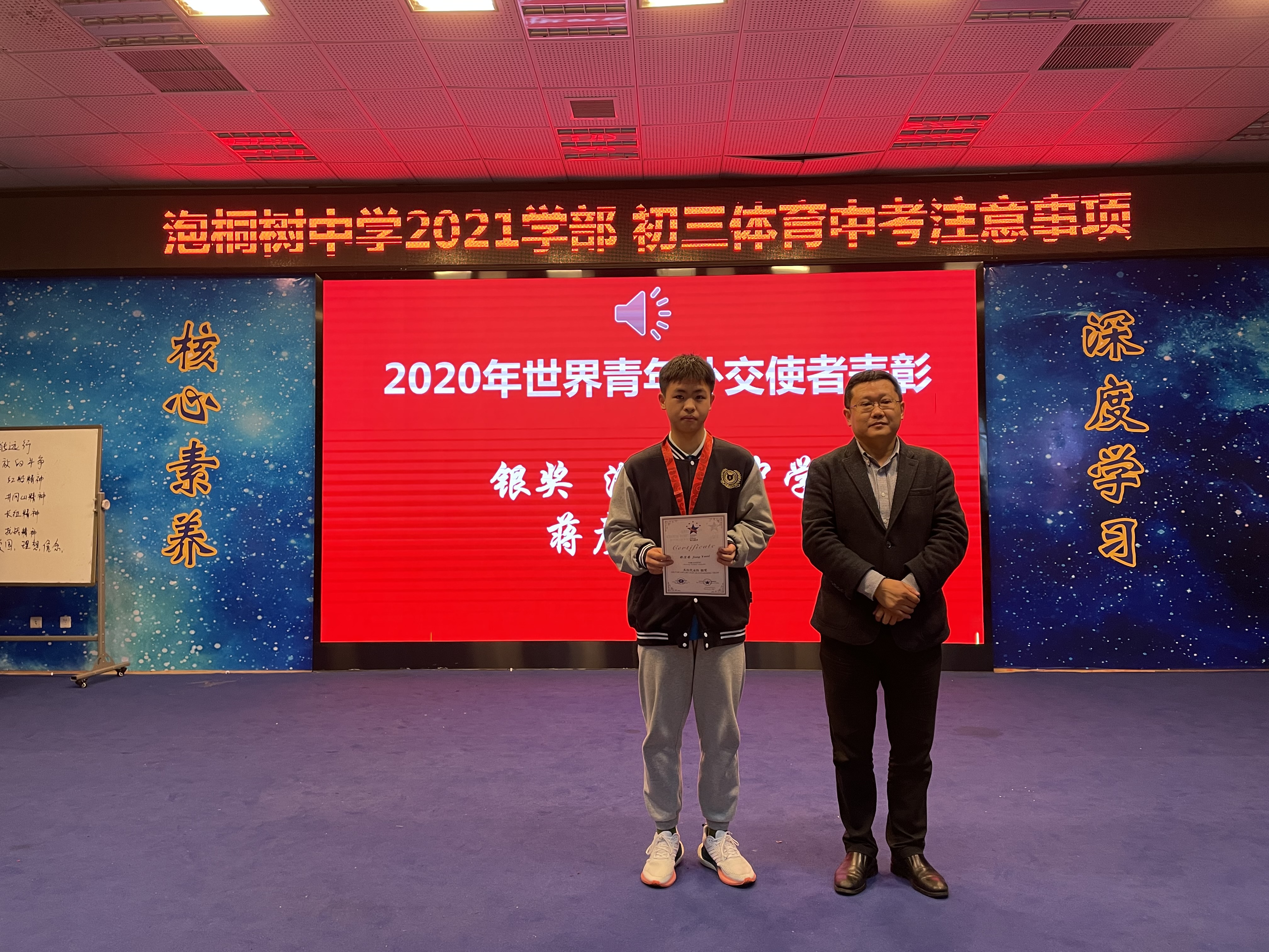 2020世界青年外交使者大赛中,由蒋彦希、朗枝颖、李悦晨、王锦程同学组成的泡中团队经过初赛的角逐进入总决赛,最终获得大赛银奖和国际人才摇篮奖荣誉榜的好成绩。杨超校长代表学校给泡中参赛队队长蒋彦希颁奖。