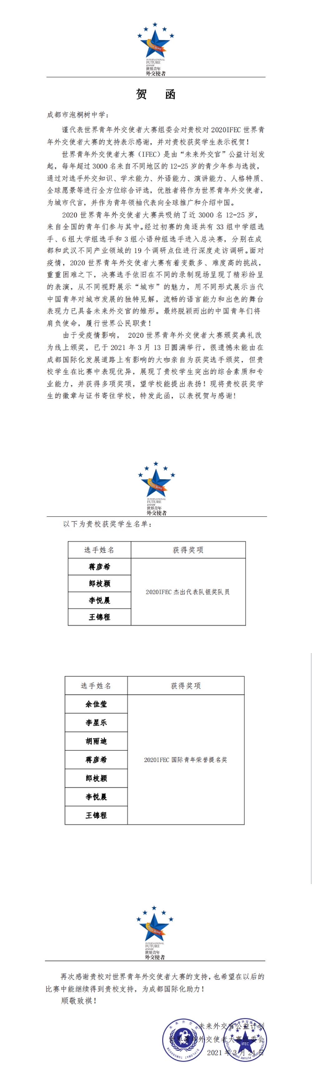 泡中荣膺2020IFEC国际人才摇篮奖