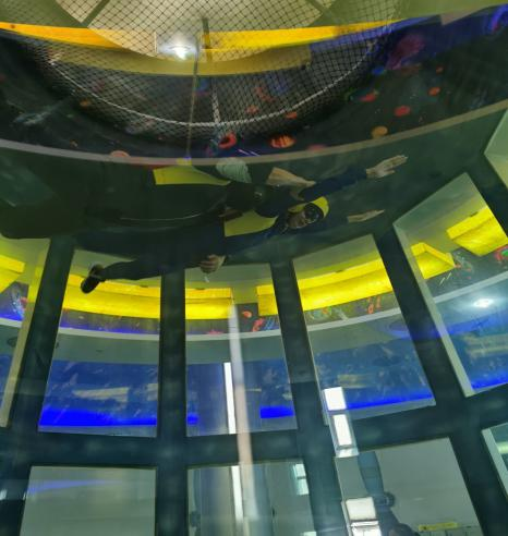 在参观过程中,同学们积极探讨,踊跃提问,收获了满满知识。接着最令人激动的环节到了——风洞体验。在这里体验到被风吹上天的感觉。大家快速换上衣服,听老师的技术要求。随后开始体验,过程中也不忘了解其利用相对动力学和空气流动的相似律的原理。