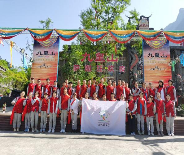 早起来到西羌九黄山,大家乘缆车来到山上,配戴着羌红参加了具有羌族特色的欢迎仪式。