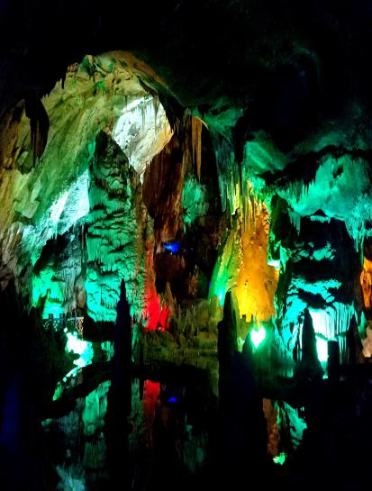 参观羌族三绝——羌碉,羌绣,羌笛。继续攀登,前往目的地——猿王洞。沿途春光拥倚群山,时光从身旁溜走,万物可爱,人间值得。猿王洞中有“瑶池洞天”,“绝壁古琴”等神奇景观,被称作梦幻宫殿洞中黄龙美景。同学们在欣赏美景的过程中,同时学到溶洞的形成是石灰岩地下水长期溶蚀的结果。