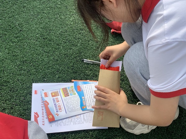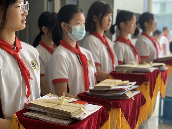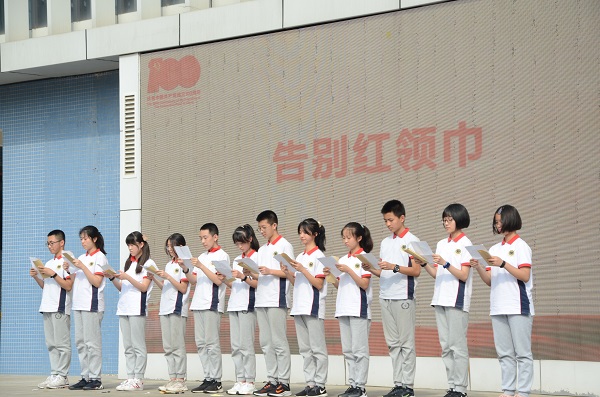 同学们在主持人的指令下庄严而肃穆地取下红领巾,与额同齐,向红领巾行注目礼。这个陪伴并激励我们的老朋友此刻依然飘扬,似有千言万语想要诉说,又似满含柔情依依不舍。同学们将红领巾小心地折叠整齐,和提前写好的青春寄语一同装入了泡中信封,即便我不再是一名少先队员,但从此刻起,红领巾将见证我对未来的期许的祝愿,始终是我们成长道路上的一盏明灯。