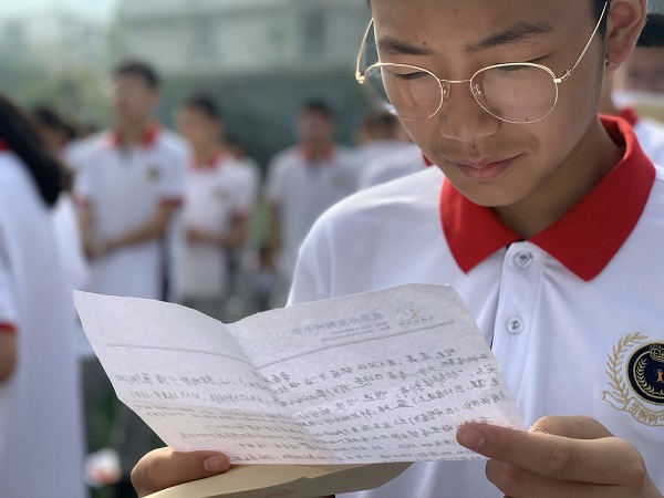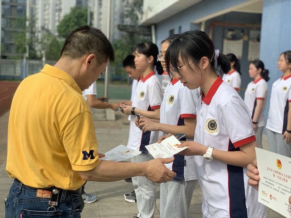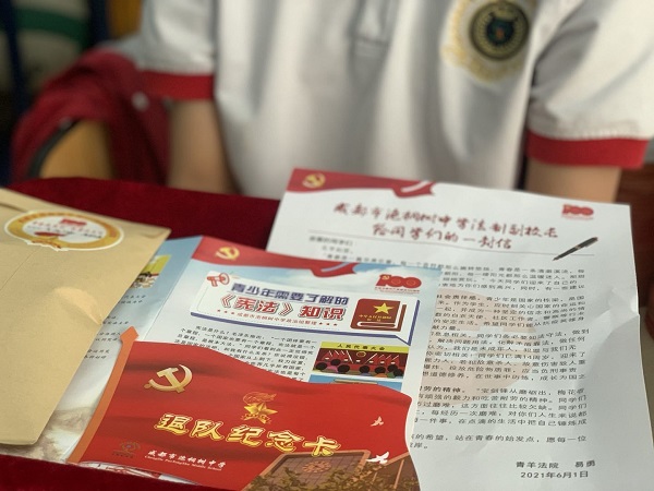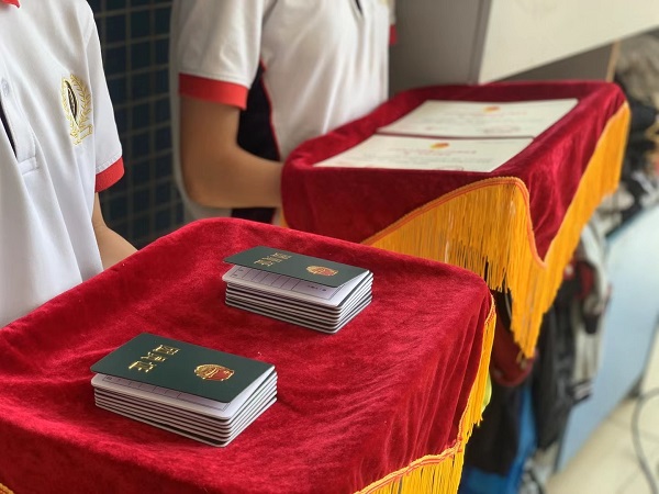接着,学生代表上台领取了学校为我们准备的青春礼,学校特别制作了“退队纪念卡”,老师希望我们永远记得梦想纷呈的少先队,记得童年的初心与美好。《法制和安全白皮书》和《宪法宣传单》意味着我们从今天起,不仅要对自己负责,更要承担起一份社会责任,老师们期望我们在以后的人生之路上严于律己、知法守法,做一个正直的、大写的人。在青春礼中,有一份特别的礼物,那是泡桐树中学的法制副校长写给每位同学的一封信。易校长提到我们要树立“天下兴亡,匹夫有责”的社会责任感;要遵纪守法,远离犯罪;要磨练坚韧不拔的意志,培养吃苦耐劳的精神。这封信中饱含着易校长对我们的希望与祝愿,激励我们担负起责任,一步步地迈向通往梦想的道路。