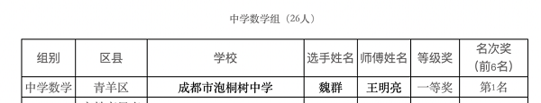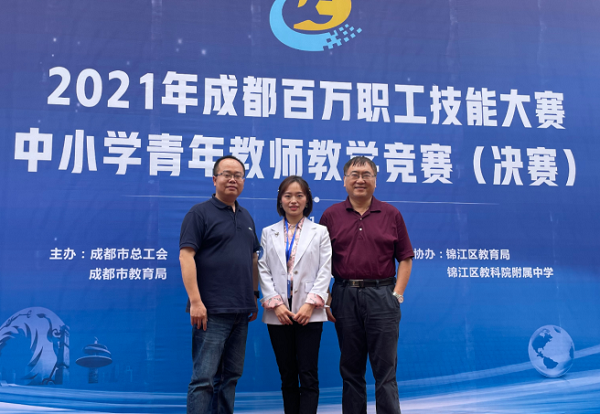 2021年5月29日,在成都市总工会和成都市教育局主办的2021年成都百万职工技能大赛中小学青年教师教学竞赛总决赛中,我校初中数学组魏群老师一路过关斩将,在名师云集的总决赛中脱颖而出,荣获市级一等奖第一名!