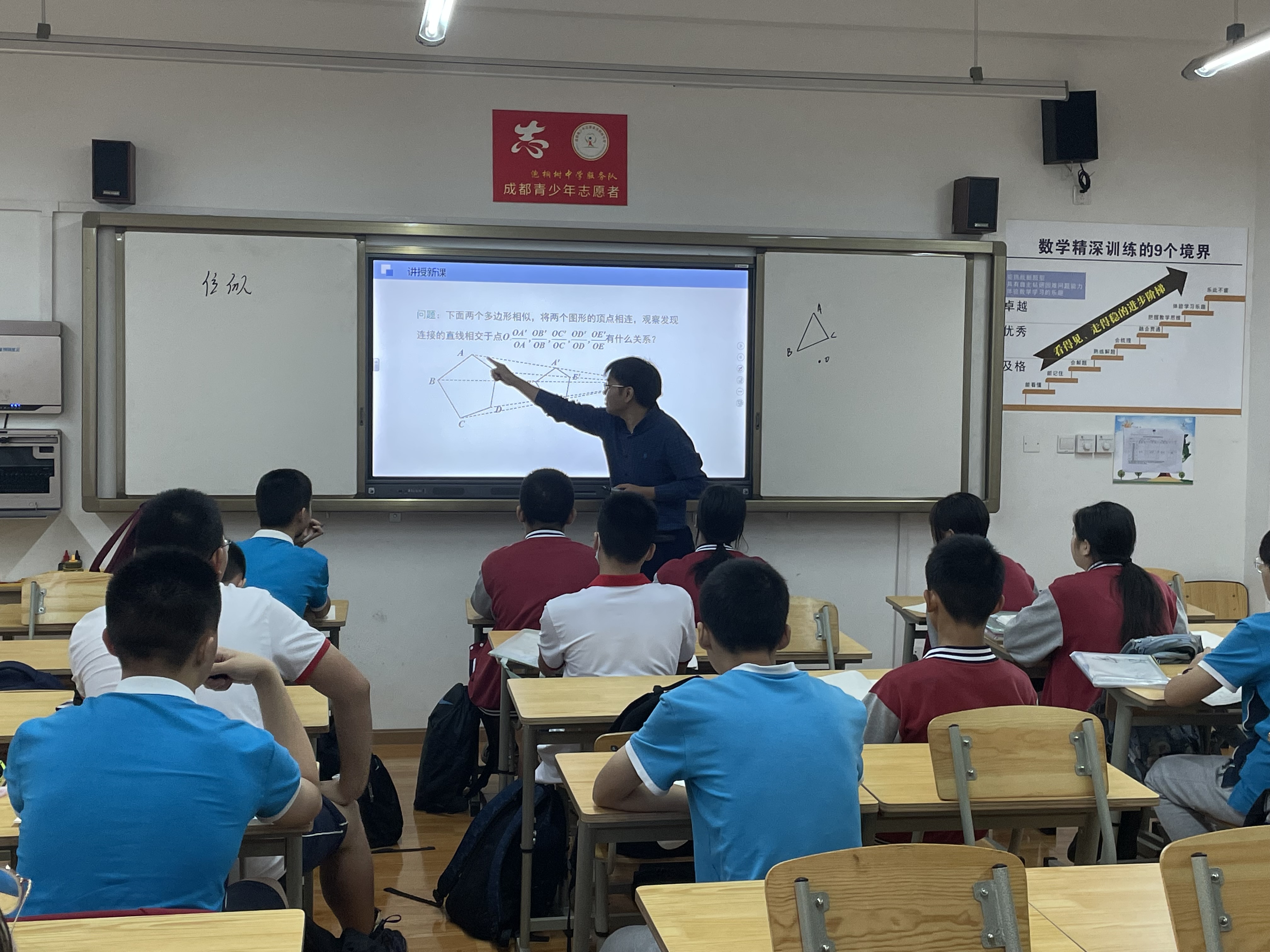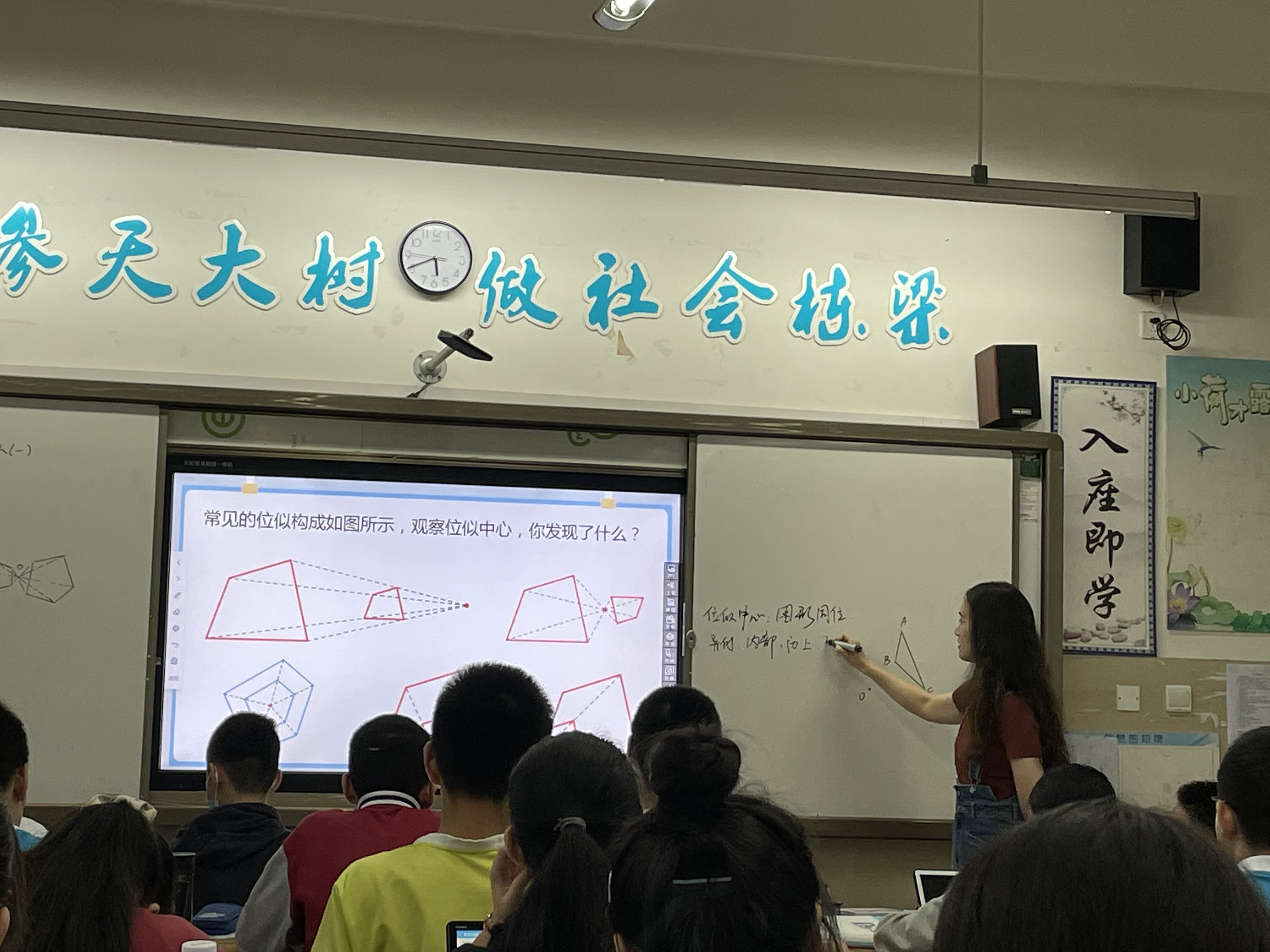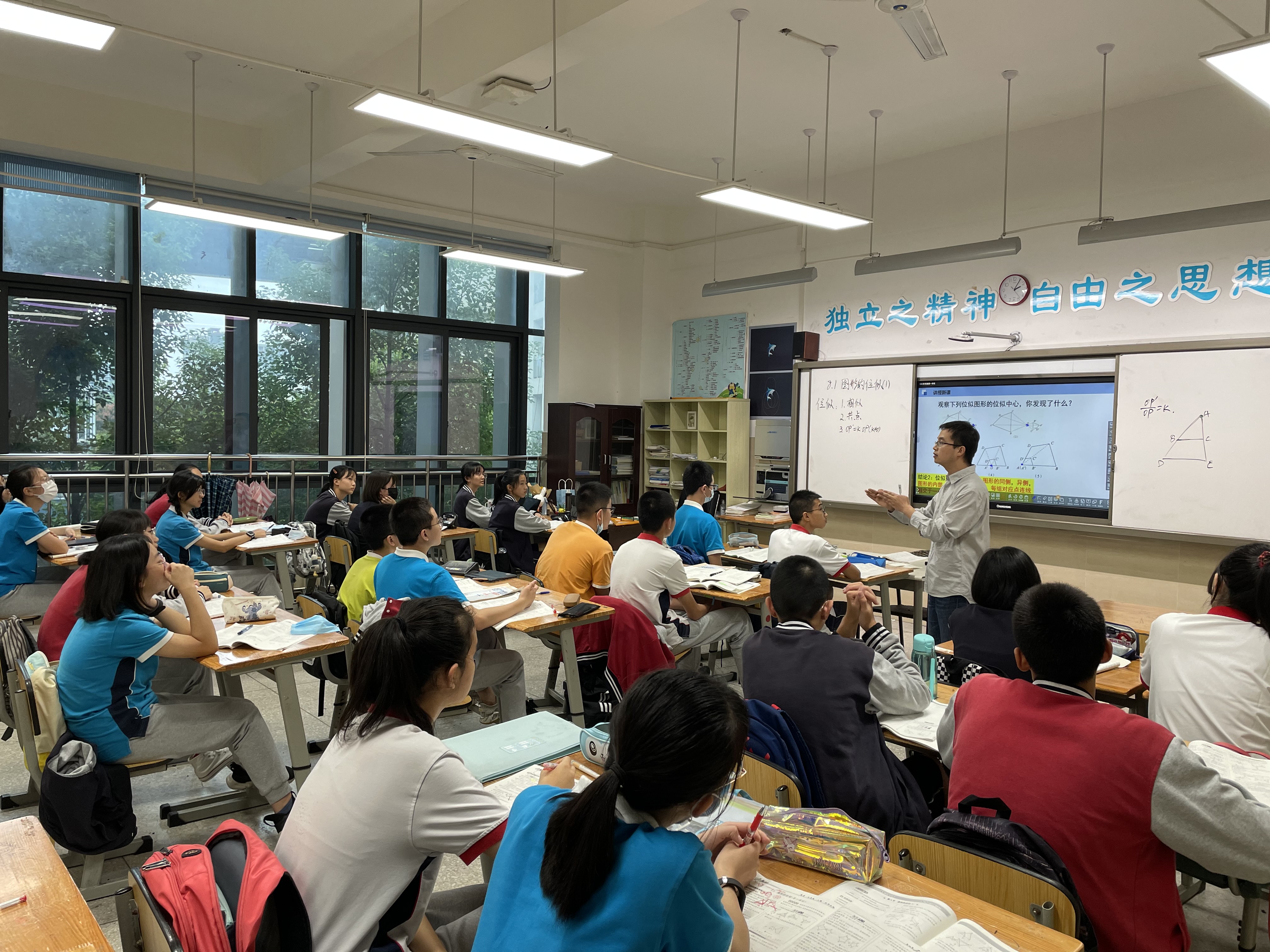 听课结束后,杨超校长与全体数学组教师展开了高效的评课活动。宋健老师在数一班的《位似图形》概念课,风趣幽默,带领学生一步一步的探究位似图形的概念与性质,聚焦中考考点;邹伶老师带来的《圆》模型专题课,通过建立模型——分析模型——运用模型,将圆中的易错题何动点问题深入分析,引导学生拓展思维;向荏杰老师的《位似图形》课,讲练结合,注重学生动手操作能力,带领学生从几何图形中抓住关键点;佘珺彤老师的《位似图形》课,课堂氛围融洽,学生参与度高,注重课堂知识的落实和对教材的把握;杨喻尧老师的《相似三角形的性质》课,带领学生规范书写格式,知识点由浅入深,习题难度分层,帮助学生突破难点。
