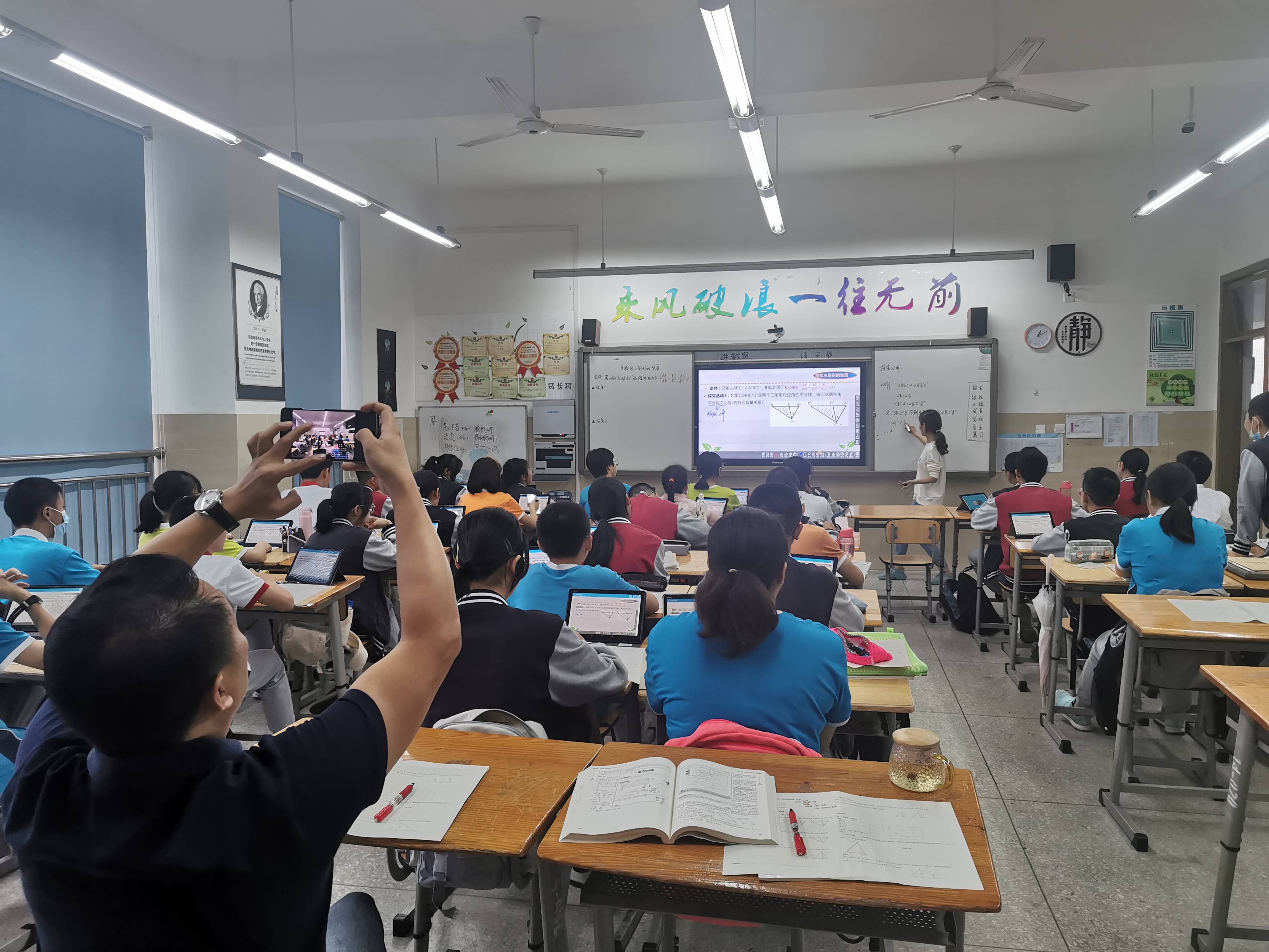9月15日上午10:20,展示课正式开始,期间,李霞霏校长等校领导随机走进课堂听课,课下与师生直接沟通交流。在发掘优秀的教学经验和典型案例的同时,对有待改进之处提出针对性建议,共同推动教师教学水平和课堂教学质量的提升,初一初二教师也积极参与到听课当中,做了详尽的听课笔记。