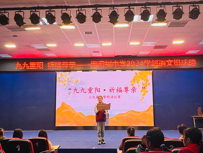 下午时分,“九九重阳·祈福尊亲”2024学部文化展演暨朗诵比赛如火如荼进行着,14位家长代表手持“重阳节”邀请函在评委席翘首以盼。看,同学们来了——