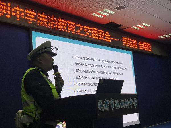 为进一步提高在校师生的交通安全意识,养成自觉遵守交通法规的良好习惯,预防和减少校园周边交通事故的发生。2021年10月29日周五下午,成都市公安局交警支队警务技能郑教官走进泡桐树中学开展《知安全 会避险》的法治教育之交通安全主题活动,郑教官身穿执法制服,从行走安全、乘车安全、骑车安全和认识安全标志四个板块给孩子们宣讲了交通安全方面的知识。