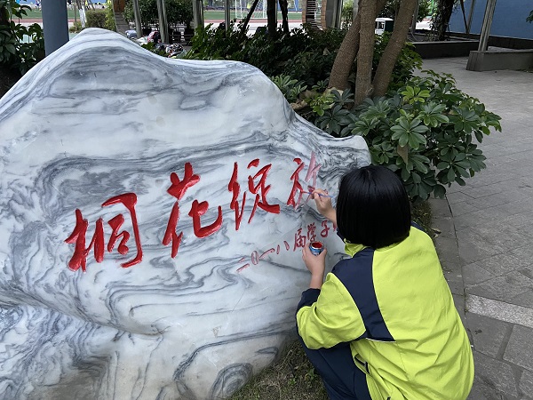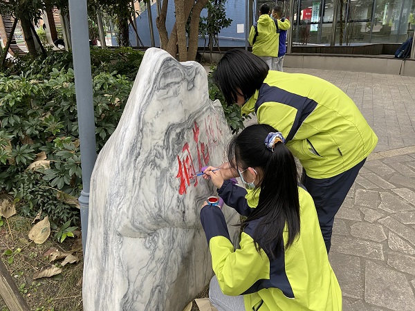 下午5时许,由校团委书记付俊超老师,带领张安琦,陈立行,蔡宏毅,吴一凡,向奕霏,曾羽兮,李若萱,柯圳杰,邓懿诚九名少先队志愿者,先在食堂门前大树下集合,再去保安处旁领石灰水进行调剂,药水调好后,大家分为3个小组,一组负责擦干净石碑污秽,再给红字上色;二组与三组分别围绕校园以顺,逆时针的顺序为学校树木刷石灰水,达到有则补刷,无则全刷的效果。