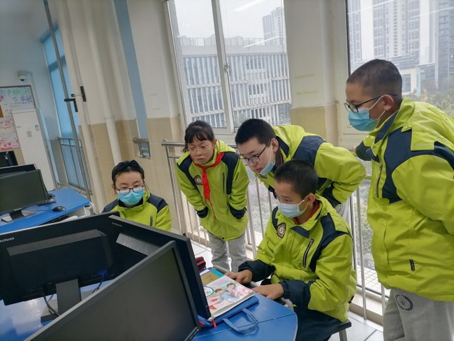 项目小组同学组长刘芷菡、组员郭昱 周茹雪 陶梓贤 曾思远在讨论