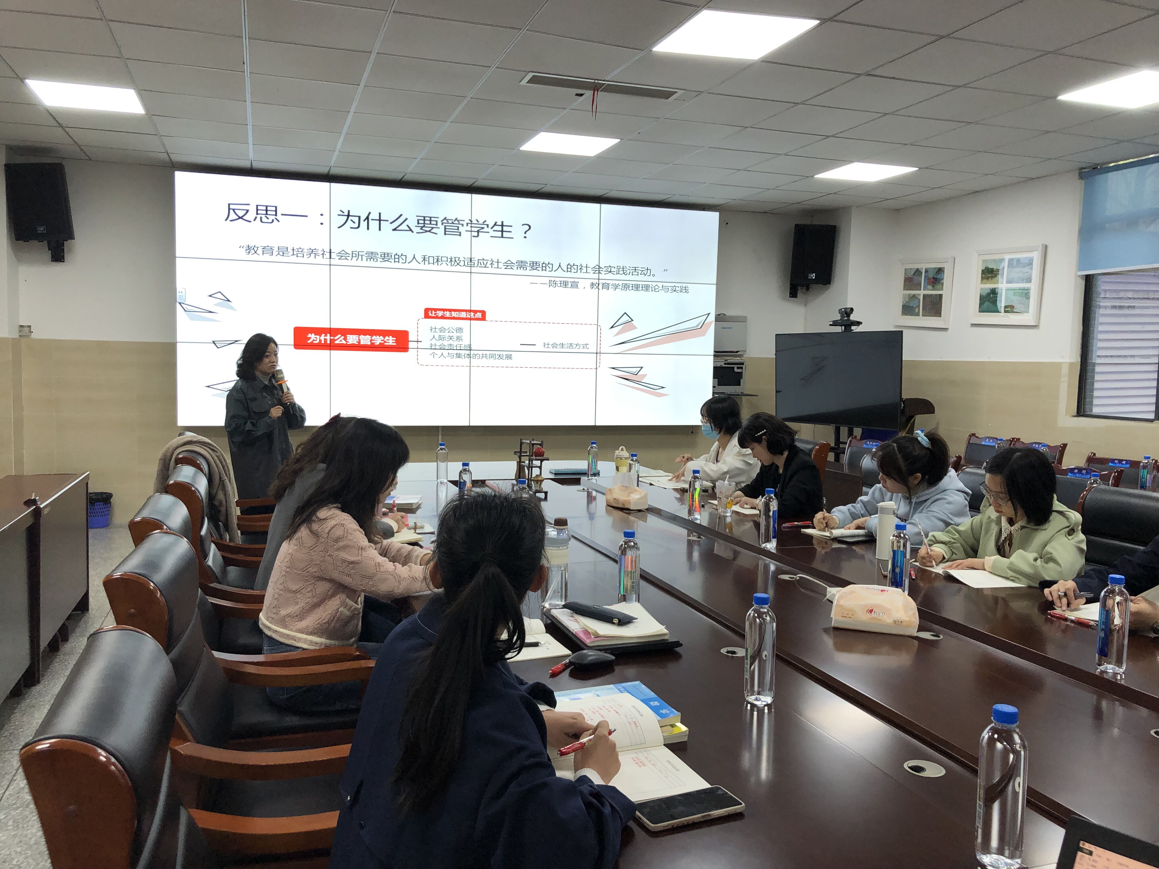 围绕“怎么说,学生才会听;怎么做,学生才会说”,李霞霏校长向青年教师们提出第一个反思——为什么要管学生,是为了让学生知道社会公德、人际关系、社会责任感、个人与集体的共同发展,即社会生活的方式。