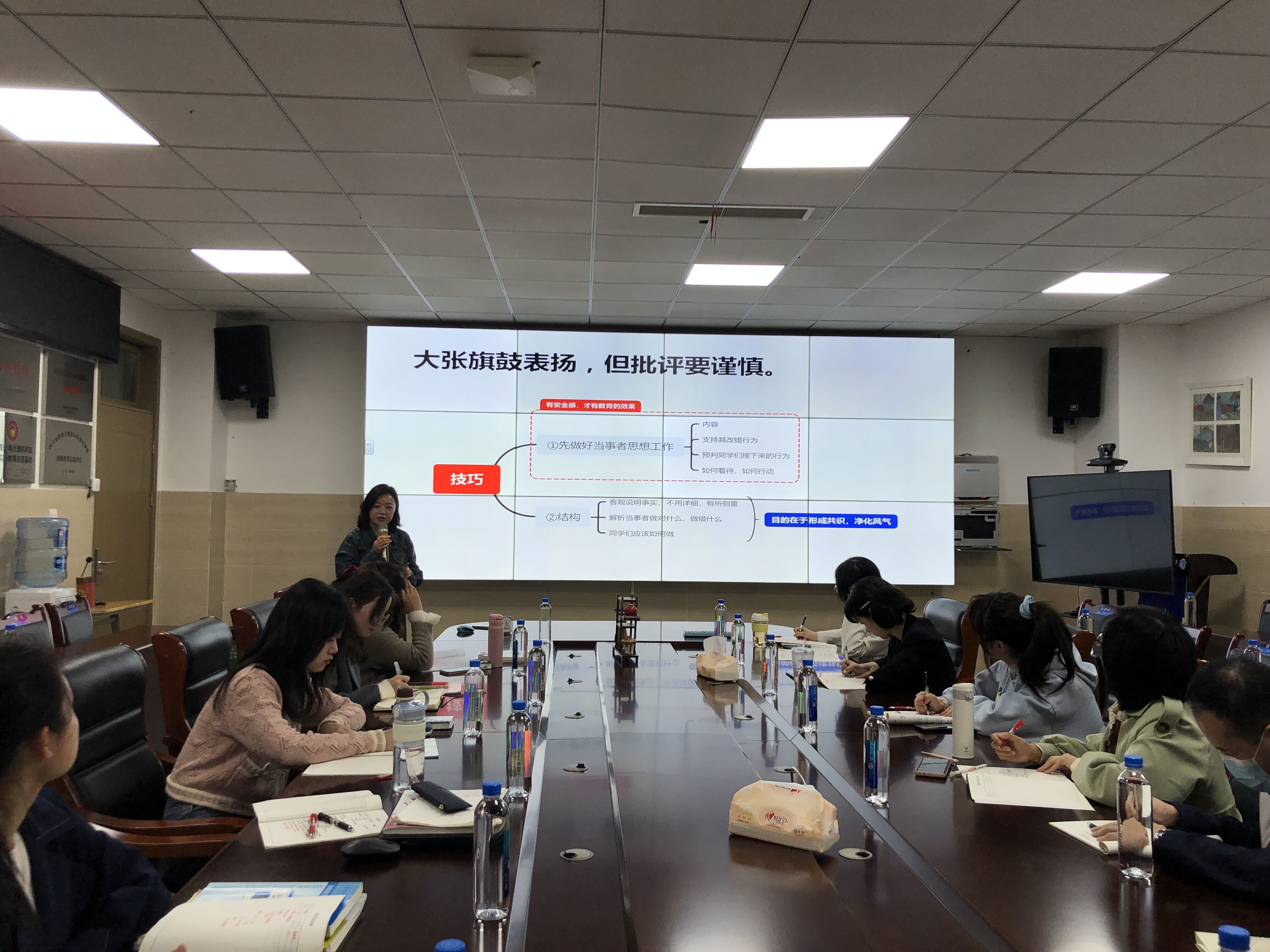 李霞霏校长又提出了青年教师们在管理学生时常会用到的“雷霆一怒”,给出了一些真实案例,来帮助老师们认识到“雷霆一怒”的目的在于迅速控制事态,保障安全,但并非适于所有情况。这样老师们在处理问题时,既指出学生言行中不当之处,也肯定正确之处,使他们感受到关爱、耐心和信任。接着,李校长提出疑问:是否事件处理的过程和结果都要面向集体?在通过案例分析后,青年老师们意识到当行为是影响面广且普遍存在时,要面向班级说明,即“大声表扬,谨慎批评。”