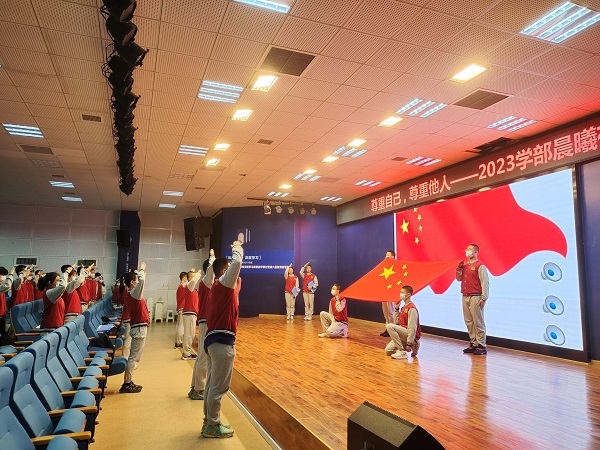 本周2023级部全体师生迎来了特殊的晨会活动,直播的形式在各导师班举行了“尊重自己,尊重他人”为主题的晨会活动。首先同学们以饱满的精神迎接了升旗仪式。