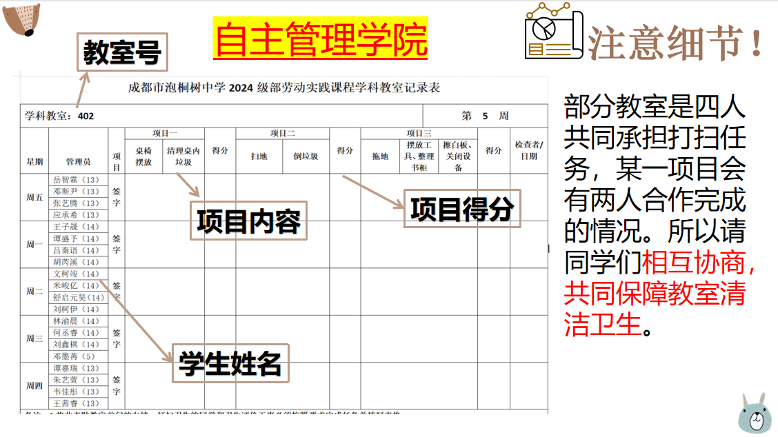 周润老师、董明湘老师、张栋老师分别讲了白自习、自主管理学院、行为规范方面相关事项。