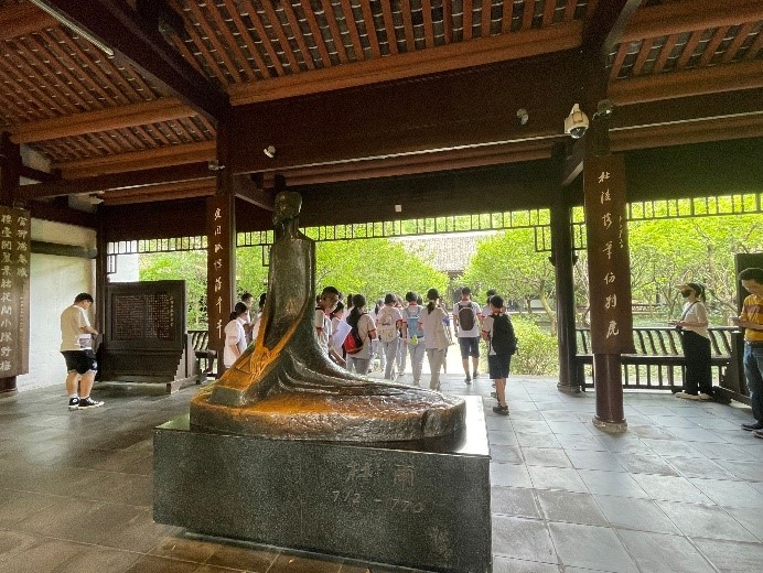 沿着草堂的中轴线继续向前,我们走过史诗堂、千诗碑,来到了茅屋景区。同学们进入茅屋进行了仔细的观察:茅屋的顶部是干枯的蓬草,整体建筑分为三个部分,狭小的空间,饱经风雨摧残而裂纹四生的墙壁,此情此景,同学们都不约而同地想到了杜甫在八月秋风中所作的“大庇天下寒士俱欢颜”,我们仿佛再次看见人生暮年的杜甫站在命运的刀尖凝望,哀民生之多艰的感慨无奈。草堂老师讲到:杜甫一生最后的安定便是寓居草堂度过的时光了。而那场秋风暴雨,也彻底浇灭了杜甫挽救晚唐的一腔热血。