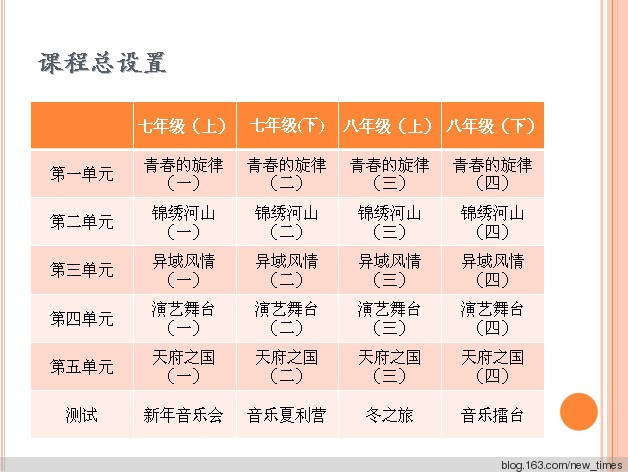音乐组展示的音乐课程开发计划,关注了学生的音乐审美、兴趣爱好、个性发展以及教学形式的多样化(舞台剧、歌剧、演艺舞台等),设计中处处融入四川民间艺术元素。课程内容分“青春的旋律、锦绣河山、异域风情、演艺舞台、天府之国”五大板块。开发的目标是“做中学生喜欢的音乐课程”,将音乐课定位为孩子展示自我的舞台。