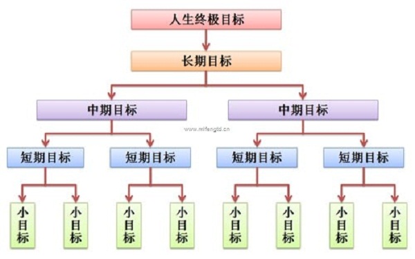 目标分成许多不同种类,如:人生终极目标、长期目标、中期目标、短期目标、小目标,这么多的目标并非处于同一个位置上,它们的关系就像一座金字塔(如下图)。如果你一步一步地实现各层目标,取得成功注定容易获得;反之,你若想一步登天,那就相当困难了。