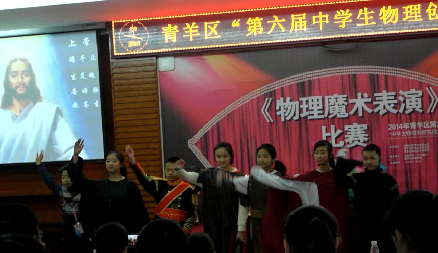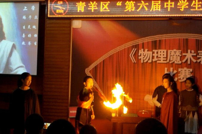 2014年12月4日,我校物理组学科组教师带领初一年级学生科学实验社成员参加青羊区“第六届中学生物理创新实践大赛”中的魔术比赛,取得第一名的好成绩!