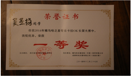 2014年12月27日星期六,我校2017级1导师班学生吴昱杨同学参加2014年雅马哈管乐之星卡拉OK长笛大赛四川赛区的比赛,以一曲莫扎特的长笛协奏曲获得第一名的成绩。