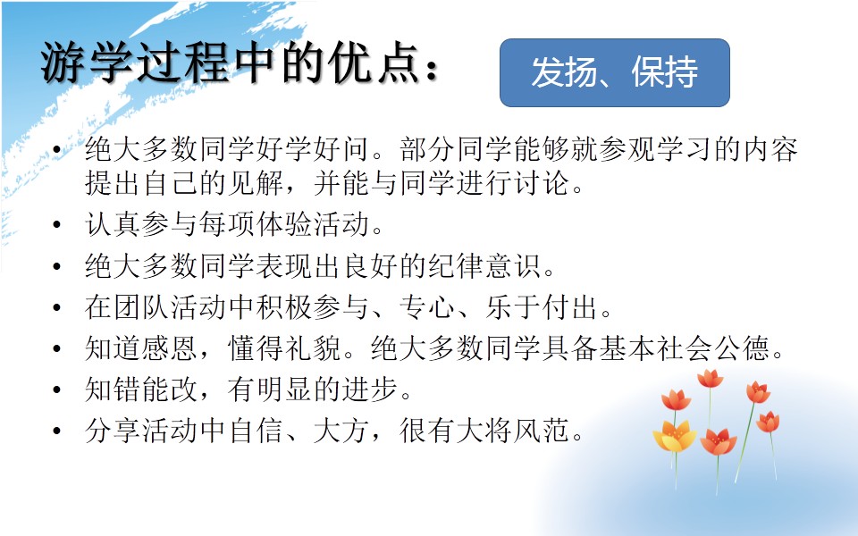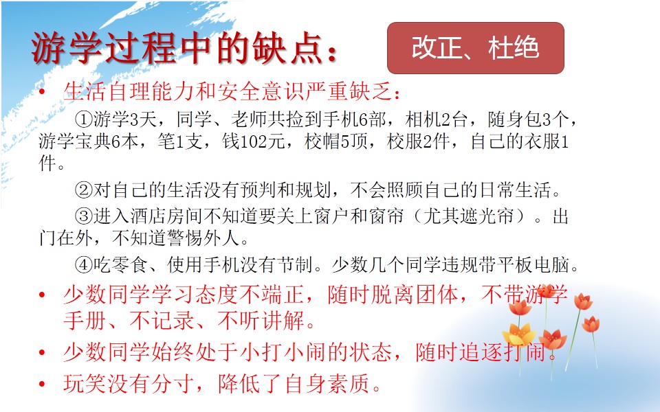 最后,成长联合会主任李霞霏老师对本次游学活动进行了总结。她说,游学不等于游玩,不能把游学当作游玩进行,她强调,游学是政、史、地、生、艺术学科的社会考察类学习。它包括了省内、省外及市内的游学。在总结分享中,李老师把同学们在游学中的优点和缺点都进行了解析,让每位同学都能对号入座,自我反思,自我总结。为以后的游学中打下基础。重点还给同学们展示了游学宝典完成情况,展示做的比较好的地方,她充分肯定了这次游学的成果。本次游学总结分享会非常成功,同学们在会后仍然回味着。脸上都充满了喜悦。