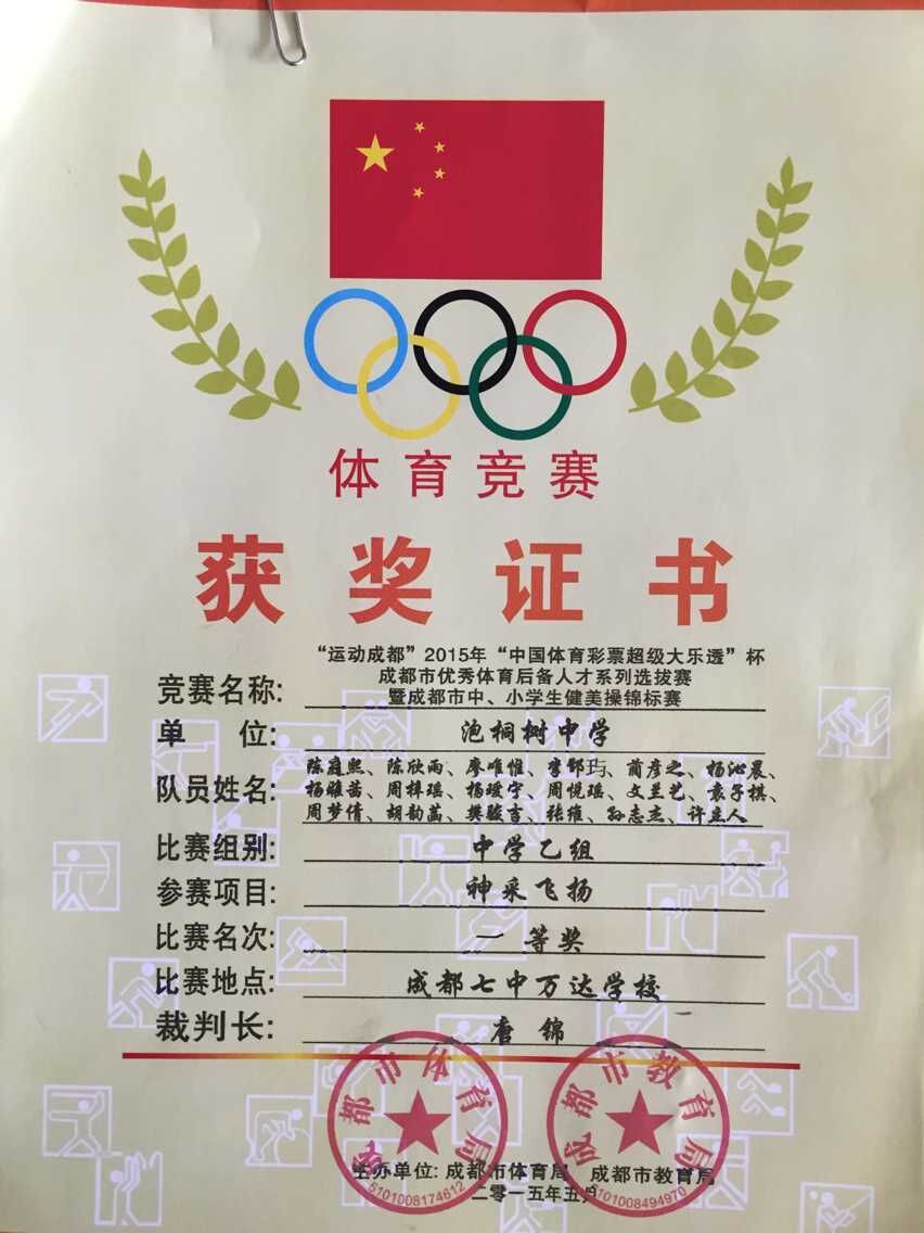 5月10日,在7中万达举办的2015年"成都市优秀后备体育人才选拔赛之啦啦操锦标赛"中,我校啦啦操队获得一等奖的优异成绩。非常感谢家长的大力支持和同学们的努力团结.