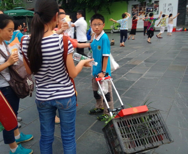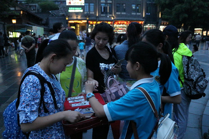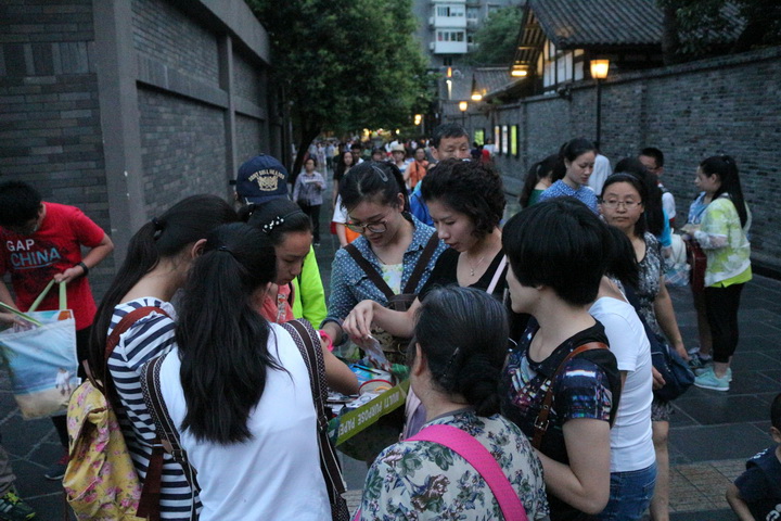 五月九日晚臻于至善社团在宽窄巷子举行了义卖活动。19:00社员们在宽窄巷子长顺上街喷泉处集合,经过简单的人员分组、商品分配后,义卖活动正式开始了。
