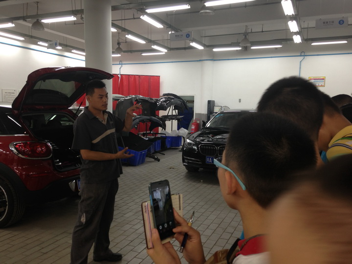 2015年7月13日,泡桐树中学开启了暑期职业考察活动的序幕。本次考察地点是全球最大的宝马5S店——成都长征宝马5S店,由容帅老师、赵时莉老师带领。早上10点,老师们和同学们冒着霏霏细雨整齐地来到了宝马5S店。在5S店工作人员的热情接待下,同学们认真地参观了销售部、售后部、车间部、后期仓库、钣金车间等。一路上,同学们都聚精会神,安静有序,边参观边记录。之后,在售后部钱总的引领下,同学们来到了会议室,在会议室里,同学们就关于宝马5s店及宝马品牌等职业问题向宝马5S店的钱总、廖经理、陈经理、崔经理面对面的咨询和了解,进一步了解了这个行业的职业状况,从而为自己的将来的职业打算奠定坚实的基础。在提问中,葛俊彦同学问到:“5S店厂区没有清洁工,那么厂区是如何维持清洁的呢”、袁锌高问到:“5S店和4S店有什么区别”、“BMW的全称及含义是什么”、高骁毅同学问到:“宝马的市值是多少”等等。这一个个的问题提出,让在场的几位经理都赞叹不已。通过职业考察,同学们收获了知识,收获了梦想。