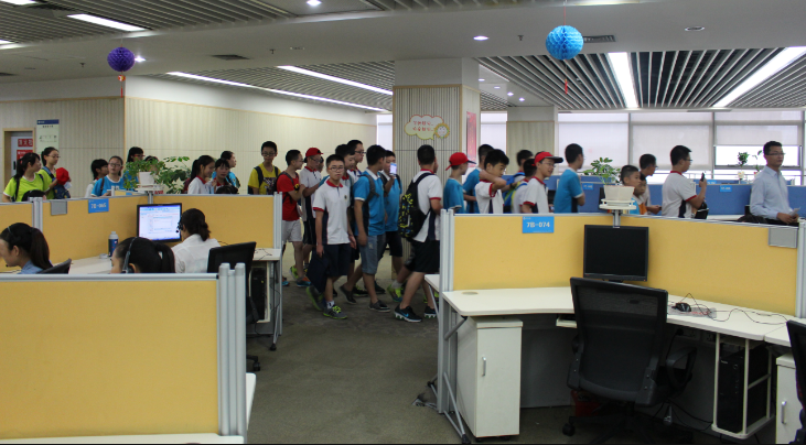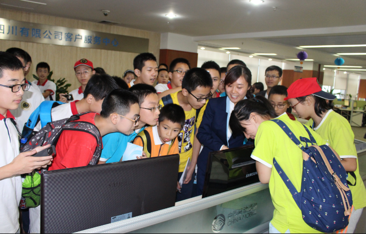 2015年7月14日下午,成都的天空一直下着雨,中国移动四川分公司迎来了76位泡桐学子,在这里,开启了泡中学生暑假职业考察的第三站。下午2点,在家长们的支持下,孩子们平安到达中国移动四川分公司呼叫中心大楼。本次职业考察内容丰富,学生们在二楼会议室里观看了视频,听讲座。进一步了解移动公司的基本概况。随后在移动公司部门主管的带领下参观了:10086呼叫中心办公大厅、职工休闲区、职工食堂等。参观之后同学们回到了会议室,就心中的职业问题向移动公司主管进行面对面的咨询和了解。袁浩峰、徐榆彬、陈庭熙、周子渲、奉榆鸿、、、等同学先后发问,将本次职业考察推向高潮!!!
