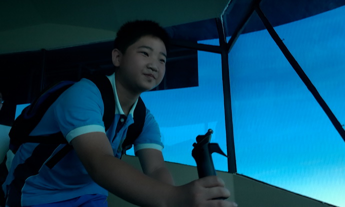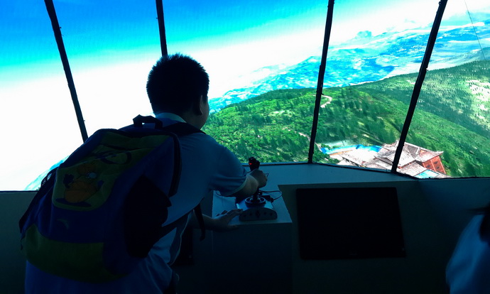 钻进“飞机”中,我们看到了逼真的峨眉山全景。更为拍手叫绝的是,这个“飞机”竟可以自己控制,同学们纷纷抢着过一把飞机瘾。“飞机”在同学的控制下起飞、降落,甚至——钻进了地下,引得一阵阵哄笑。