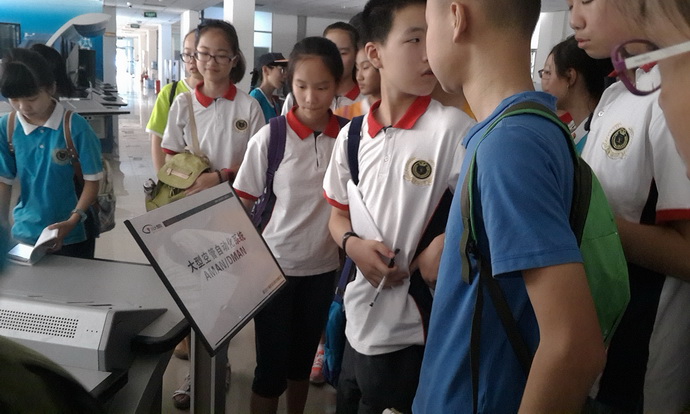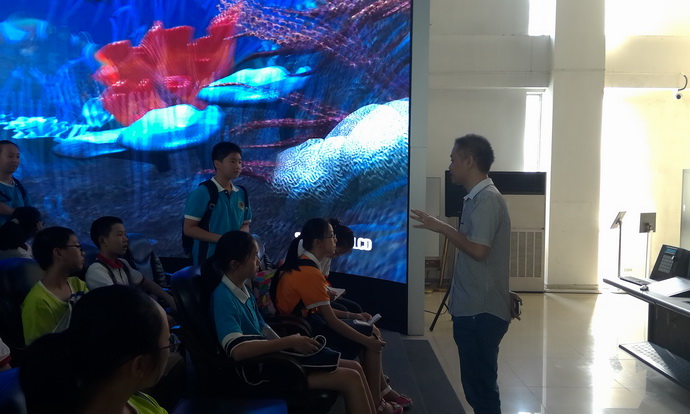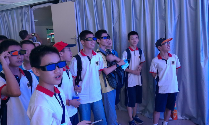 随后,同学们参观了弧形屏幕,戴着3D眼镜观看了关于辽宁舰、海底世界等的动画资料,3D效果逼真,使大家仿佛就置身其中。据悉,该项技术目前主要应用于影院、监控等方面。