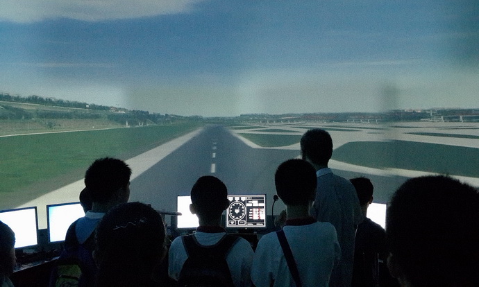 紧接着,同学们又参观了塔台视景模拟机。机器模拟的是北京首都国际机场在不同天气状况下的飞行状态。在塔台完全静止的状态下,同学们却体验到了飞机助跑、起飞等感觉,大家都惊叹于科技的魅力。