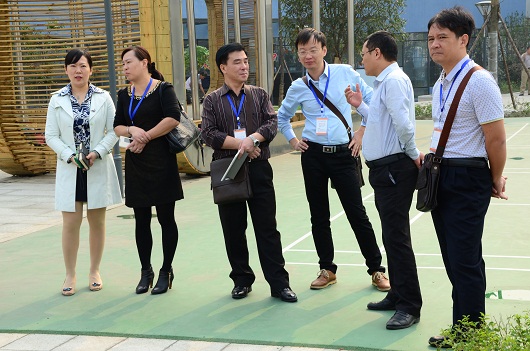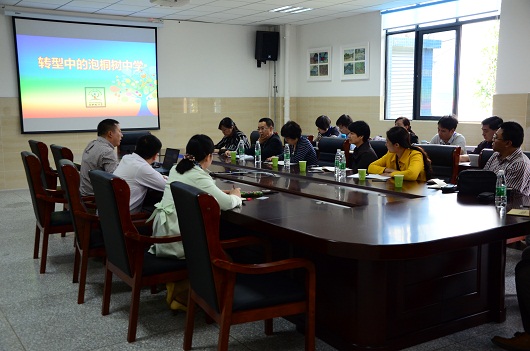 两队代表团在高仁辉校长和杨超副校长的陪同下参观了我校学科教室、走廊布置,大课间学生锻炼的情况等。校园参观结束后,全体代表团成员与我校领导在学校会议室就学校的教学理念、课程设置、学校管理和学生评价管理等进行了座谈。座谈会上,高校长就泡桐树中学选课走班的具体实施情况向各位代表作了《转型中的泡桐树中学》的报告。
