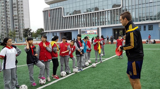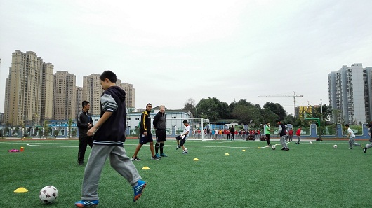 10月27日,洛杉矶银河俱乐部主席卓然老师和领队Zach带领俱乐部教练Rob与Chris来到成都市泡桐树中学,一场充满活力的足球课正式拉开帷幕。此次足球课时长80分钟,分为两个班进行。Rob教练和Chris教练分别带领一个班的学生在足球场的两端进行训练。课上孩子们积极主动地与教练们进行互动。两位教练主要采取了游戏式训练的方式,让孩子们在快乐中掌握踢足球的技巧。