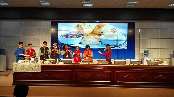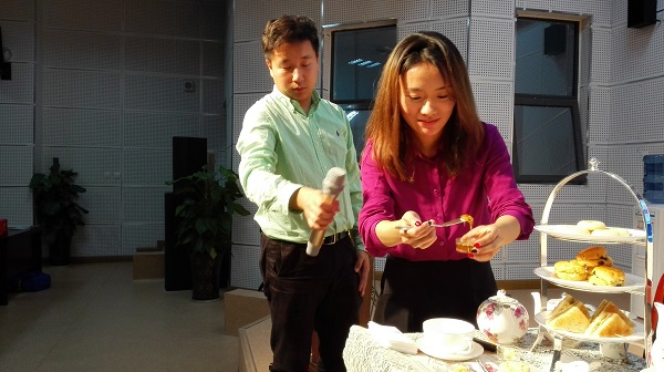随后,Tracy老师又为我们介绍了下午茶的历史,品尝下午茶的顺序及吃法,需要使用的餐具及如何摆放位置等等。大家都听得津津有味。期间,Tracy老师也请了台下的一些同学上台品点心,尝红茶,谈感受,还教同学们吃传统英式点心“Scone”。