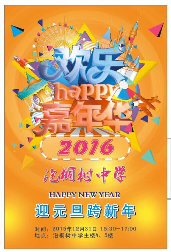 2015年12月31日,泡中上下喜气洋洋,各班张灯结彩,校园里到处洋溢着一派节日的热烈气氛,各班的嘉年华活动如火如荼的开展着。走廊里用孩子们亲手画的一幅幅精美的海报妆点着,各班进行着丰富多彩的班级游戏活动,都是同学们精心准备的,各班活动现场精彩不断。丰富多彩的游戏,展现了泡中孩子们对美好未来的畅想,表达了对新年的美好祝福。