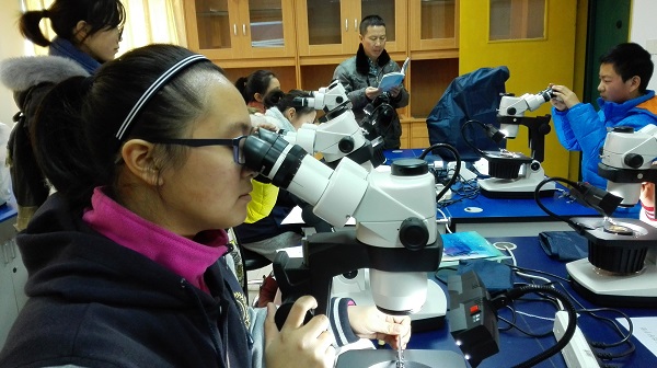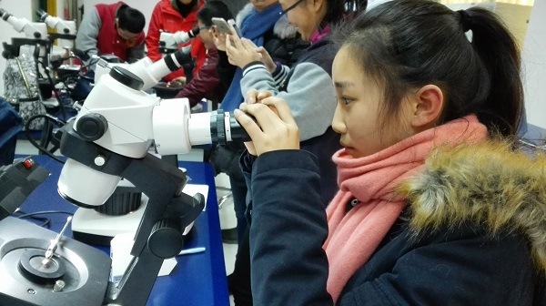 第二组同学的学习地点在实验室,学习过程中,孩子们了解到基础的宝石鉴定是从颜色、透明度、亮度、硬度入手,而宝石的折射率成为了鉴别的关键。同学们利用10倍放大镜对宝石进行了检测,再用折射仪考察了宝石的透明度折射率,把自己检测的结果详细记录后,与授课老师进行了一系列探讨,得出检测结论。虽然孩子们的结论并不完全正确,但在动手操作过程中,他们对自己过去不曾了解的鉴定领域有了一点认识,对于宝石鉴赏也有了审美启蒙。孩子们说:以后出门不怕假货啦!