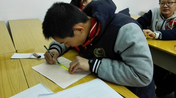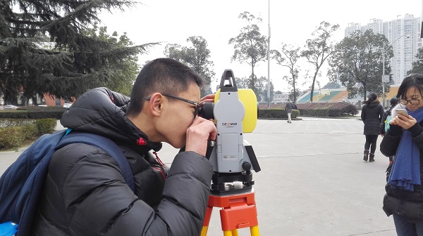 第一组同学在成都理工大学地理学院楼下架起全站仪,输入测站点的坐标和仪器高以采集数据,再用仪器瞄准定位棱镜,记录显示的坐标,比较此坐标和输入点的坐标。紧接着调整棱镜高,将棱镜树在待求点,如此反复,记录下各个指定点坐标后,绘制出一幅地势坐标图。整个学习过程中,孩子们在室外吹着寒风却不觉得辛苦,每个同学坚持完成自己的任务,冉皓钧同学拿着棱镜确定坐标,以便自己的队友清晰地瞄准目标测定坐标,认真敬业的神态得到带队老师的赞赏。