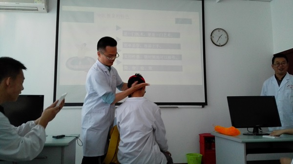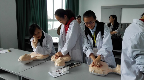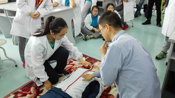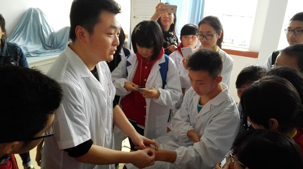 同学们还在中医标准诊室,参观了脉搏仪、舌相模型、望诊图谱等“望、闻、问、切”教学工具,亲自感受把脉诊病过程;在解剖楼,参观解剖标本馆,了解人体的神秘结构;在临床医学院附属医院的临床技能中心,学习了针灸推拿知识;在急救培训中心,学到了心肺复苏、止血、包扎、搬运等急救知识。