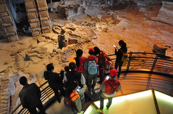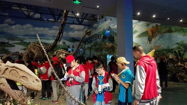 同学们走进了自贡恐龙博物馆,一起揭开了6550万年前的白垩纪末期忽然灭绝给人类留下的千古之谜。脚下一片由无数骨骼及植物组成的化石海,引发了同学们对于数千万年前让如此规模的生命埋迹于此的原因。