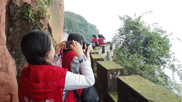 行走在遮天蔽日的临海当中,两旁密集的老竹新篁拱列。天然红砂石铺成的路面与绿色屏风般的楠竹交相辉映,让同学们感到格外的心旷神怡。漫步蜿蜒曲折的林间小道,处处感觉竹海的诗情画意,记录下这一片绿的颜色,见证这一片绿的诗意,倾听这一片绿的竹语。走在云海之中,像乘坐一叶小舟,在波涛汹涌的大海里航行,时而直冲云霄,时而滑向谷底,能领略大海中乘风破浪,登云踏雾的感觉,无穷乐趣尽在其中。
