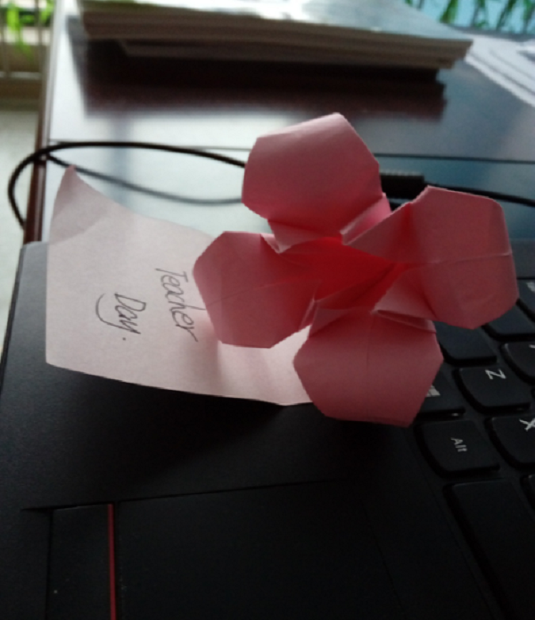 9月9日早晨7:00,不织布/无纺布DIY社团的社长和几位社团精英就马不停蹄地赶到学校,在每个老师的办公桌上放上社员们亲手制作的小百合,贴上祝福的纸条,营造出了温馨的教师节气氛。