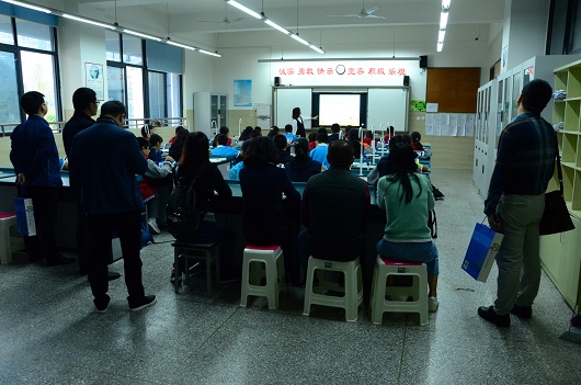 一行领导在我校高仁辉校长、杨超副校长的带领下参观学校的校园环境建设。随后,左局长一行进入我校独具特色的学科教室,现场观摩课堂教学,体验走班教学。