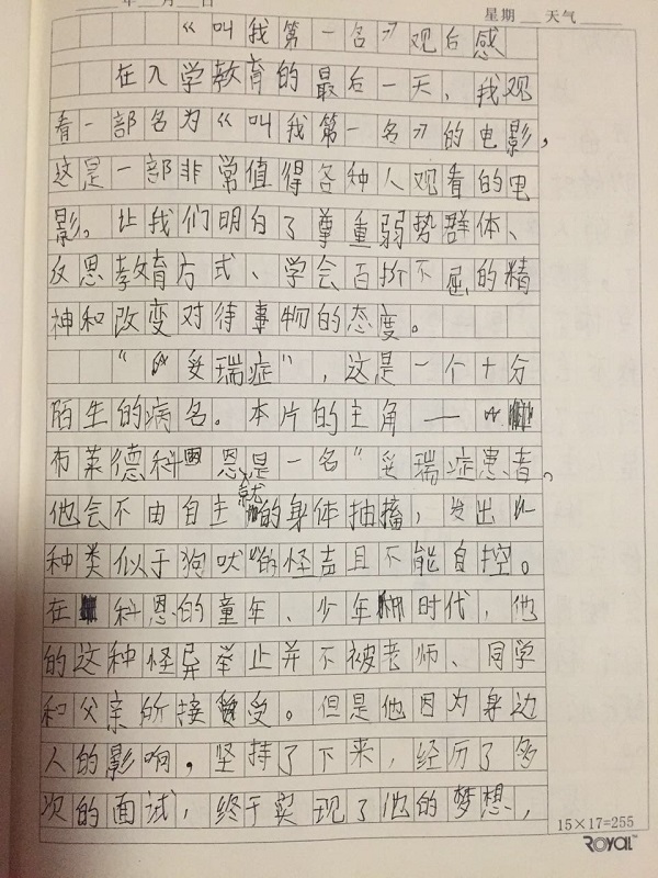昨天,我们在老师的组织下看了一部电影《叫我第一名》。这部电影的主人公布莱德从小就患有妥瑞氏症,老是控制不住发出怪叫,经常被人嘲笑。为了改变自己的处境,他努力学习本领,梦成为一名教师。于是他拿着自己的简历到处寻找机会。在布莱德试遍了所有学校、碰了无数次壁后,终于有一位宽容的校长接受了他。布莱德当上教师后,虽然有时还是控制不住自己要发出怪叫,但他用宽容、慈爱、善良的品质赢得了所有同学和家长的认可。