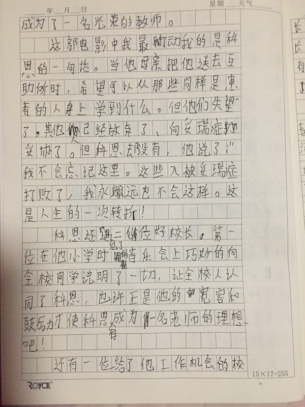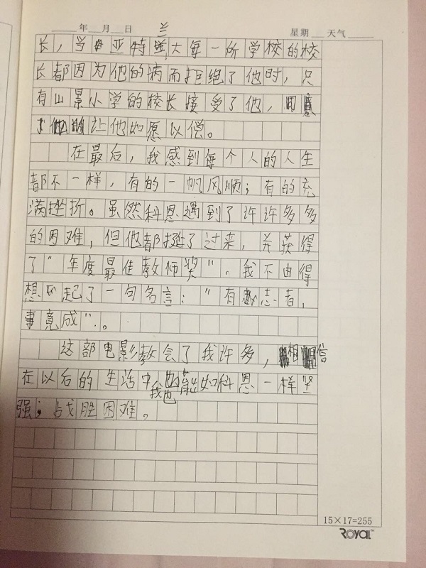 我看完这部影片后十分感动,因为波波克服了许多困难,让我最感动的是波波跑了好几十所学校,最后当上了一名二年级的老师。在找学校的过程中,波波遭到了无数次的拒绝和讽刺,因为一个患有妥瑞症的人想当老师在大部份人眼中是一件十分可笑的事情。但他一直不放弃,所以我从他身上学到了只要坚持自己的梦想,不放弃,就成功了一半。所以做任何事也要坚持不懈,比如在打鼓时,我遇到过很难打的曲子,就不想练了,可对比波波遇到的困难,这点小事又算什么呢。