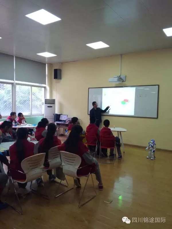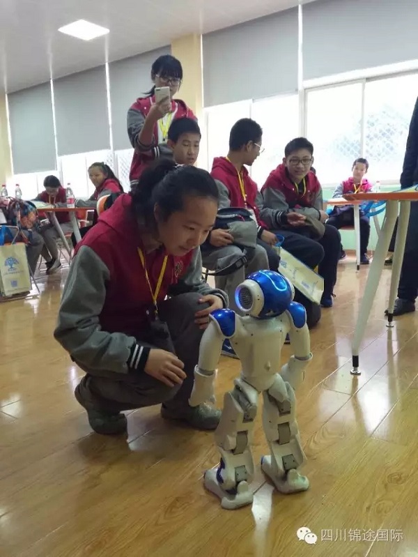 在这里,同学们见到了一台智能机器人——NAO。它可以按照人的指令进行一些简单的动作与交流。NAO用一段“小苹果”舞蹈欢迎了同学们的到来,随后并和同学们进行了互动。NAO的智能水准瞬间引爆了同学们探知智能机械的热情!