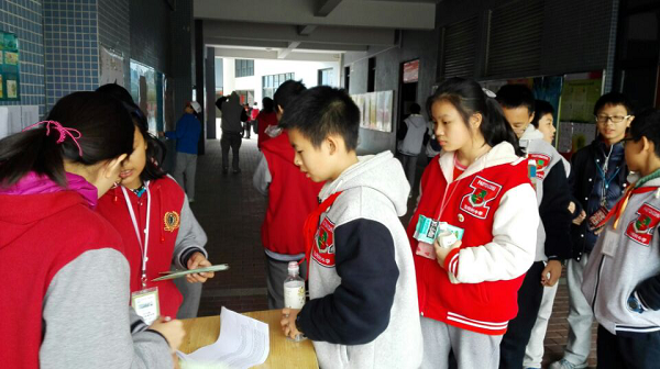 同学们排着长长的队伍等待拿讲座的门票