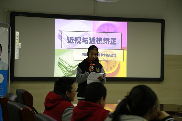 成都中医大银海眼科医院眼视光中心专家谢艾芮老师为我校60余名学生、家长及老师们开展了专业、有趣的青少年近视科普宣传教育讲座,采用问答、图片等直观的模式进行眼健康科普教育,讲座围绕青少年近视产生的原因、保护和预防展开,在轻松愉快的氛围中向大家科普了视力保护相关知识。