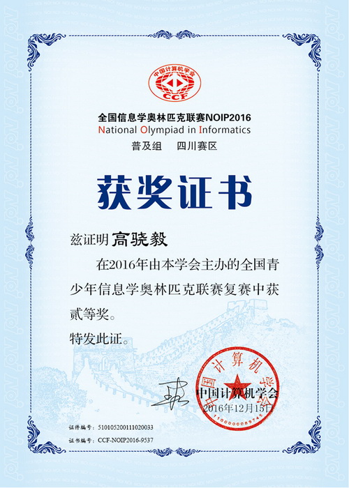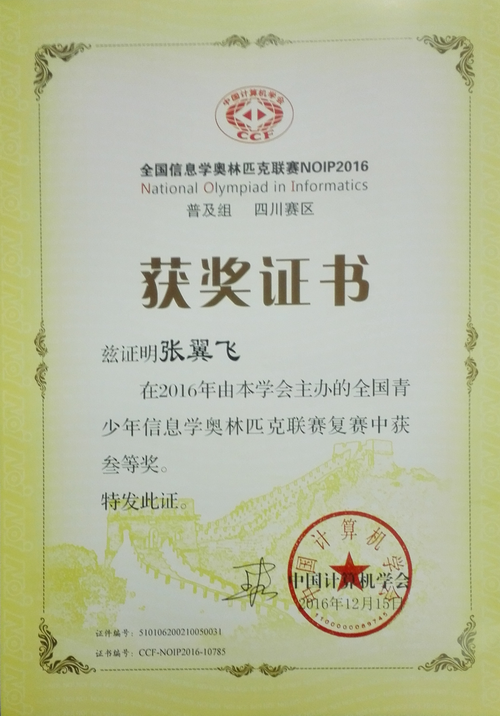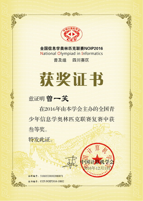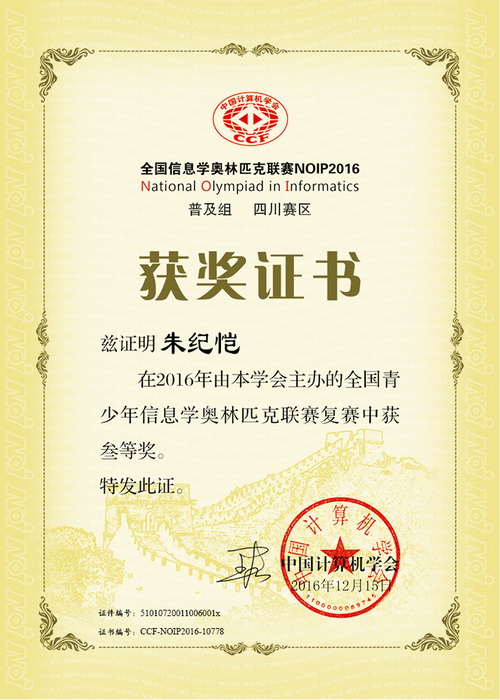 在学校领导的大力支持下,创新技术中心克服重重困难,带领我校学生参加信息学竞赛。NOIP2016获奖人数与获奖等级明显提升。热烈祝贺我校学生在NOIP2016信息学竞赛中取得优秀成绩。获奖名单如下: