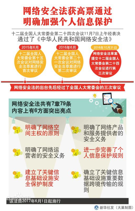 《网络安全法》是我国第一部全面规范网络空间安全管理方面问题的基础性法律,是我国网络空间法治建设的重要里程碑,是依法治网、化解网络风险的法律重器,是让互联网在法治轨道上健康运行的重要保障。《网络安全法》将近年来一些成熟的好做法制度化,并为将来可能的制度创新做了原则性规定,为网络安全工作提供切实法律保障。本法在以下几个方面值得特别关注: